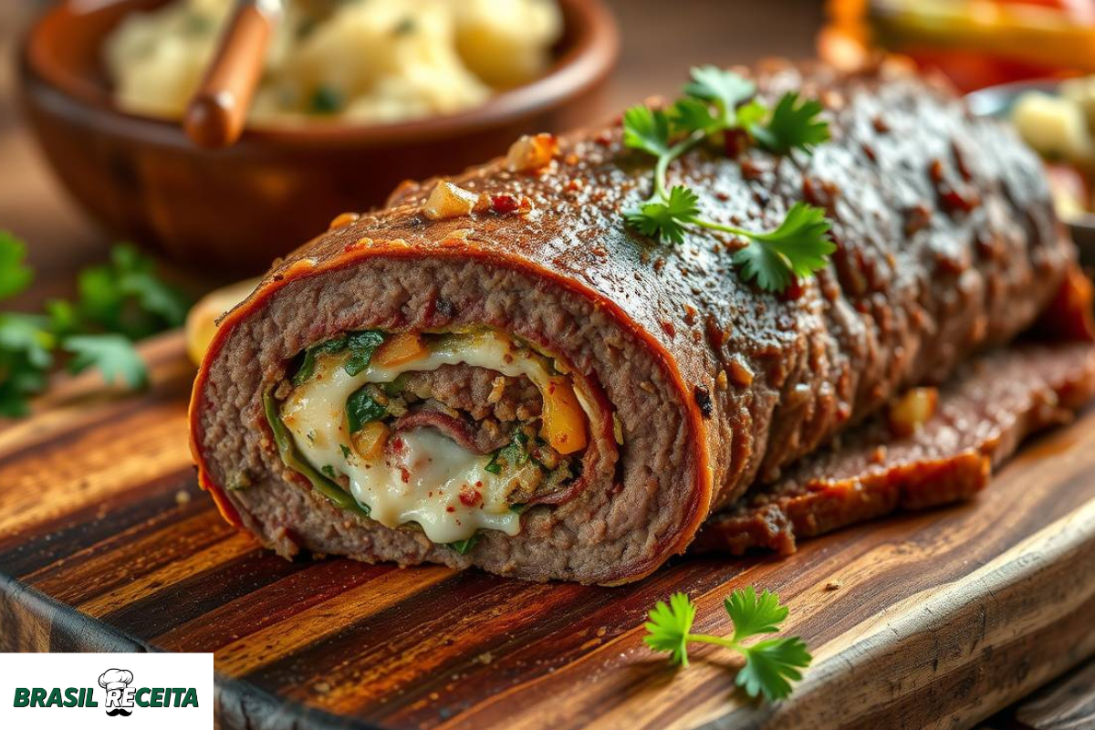 Consequentemente, o prato torna-se ideal para almoços em família, jantares especiais ou ocasiões festivas. Ademais, o rocambole de carne moída garante suculência, textura agradável e apresentação sofisticada.